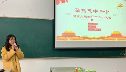 8-128寝室,则是从十九届五中全会内容、国家规划、个人目标三个角度去展开分享。为我们深入讲解了十九届五中全会的召开时间、召开地点、以及具体会议内容。其次概述我党如何在2035年基本实现社会主义现代化的远景目标。最后结合寝室同学实际情况规划了在未来15年可以实现哪些小目标。