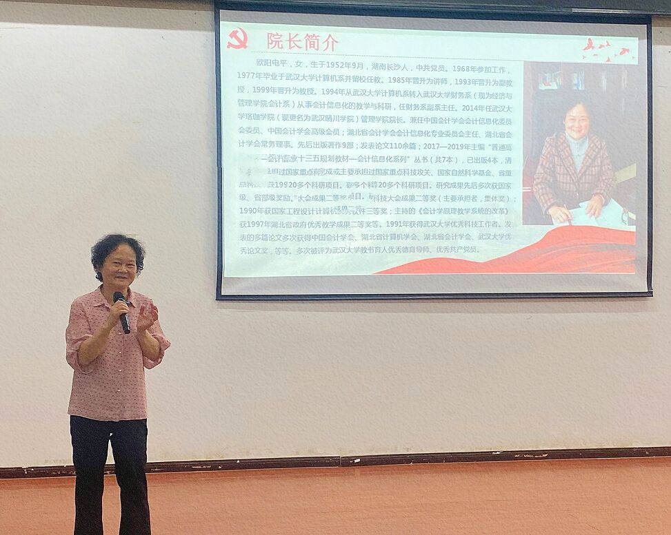 随后,公司经理欧阳电平教授就公司发展历程、会计专业学科前沿知识、智能会计实验班组建等给同学带来一场生动的学术报告。她特别针对会计专业做了详细分析,让大家对“会计”有了全新的释义,并鼓励大家积极报名首届“智能会计实验班”。欧阳经理从会计信息化角度全面剖析会计专业,发展即将步入电算化、智能化。随着现代技术的不断发展,对会计从业人员的专业能力有了更高的标准,不仅专业理论知识要过硬,还要熟练掌握各类财会软件的应用。