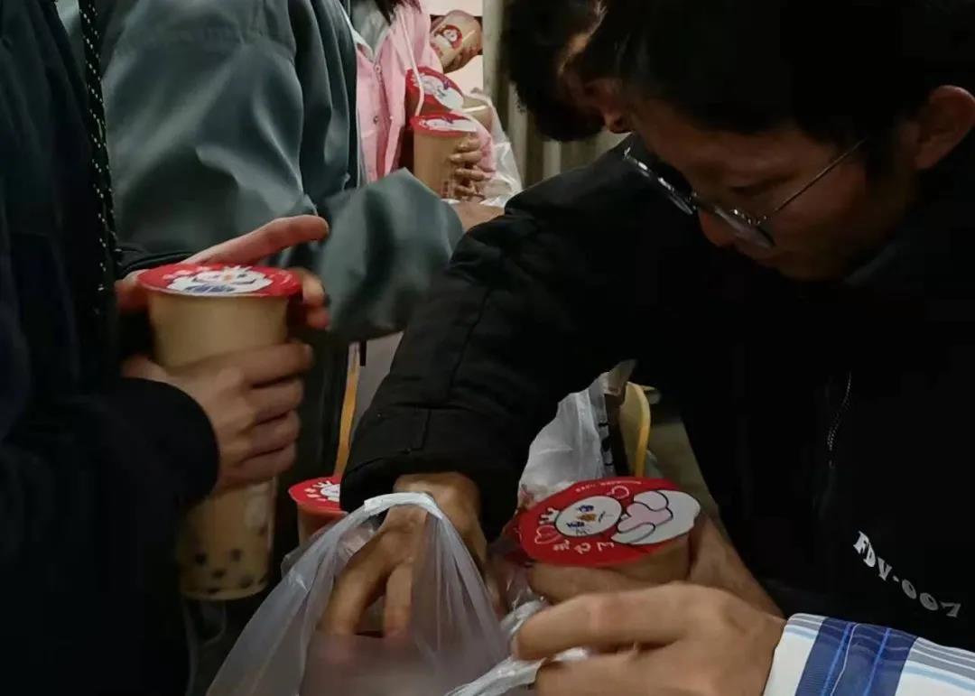 活动中间,朱俊杰老师为大家送来了暖暖的爱心奶茶,每人手捧一杯奶茶,冬意浓浓。员工们纷纷表示,又能学知识又有奶茶喝,做工管专业的员工太幸福了!朱老师说,感谢大家的支持和配合,咱们专业的《房屋建筑学》课程才能成功获批湖北省一流本科课程,同时每年的学科竞赛也是战果累累,希望未来大家能更上一层楼!