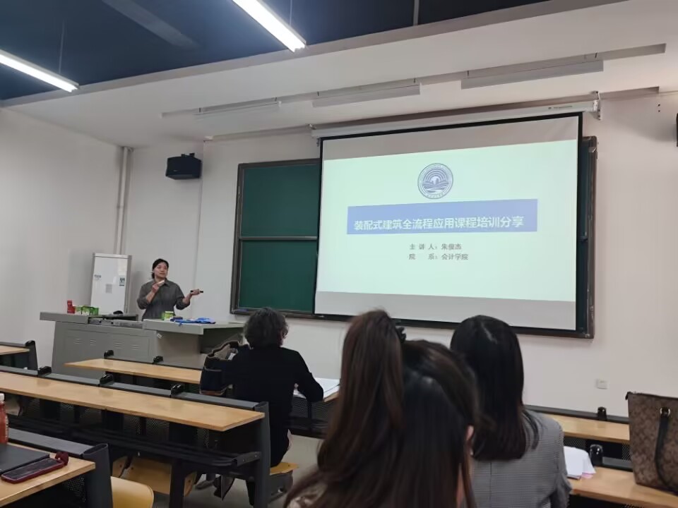 随后工管系朱俊杰老师进行了装配式建筑全流程应用课程培训分享。朱老师重点介绍了装配式建筑的概念、意义、以及发展前景,还有Revit软件、广厦CAD软件、BIM-FILM软件等培训成果。朱老师还现场展示了几个装配式施工的场景以及具体的施工流程,施工动画非常形象生动。老师们进一步了解虚拟施工,有助于工程管理专业后续专业建设以及课程建设。专业建设要紧跟时代发展,只有找准方向才能不断向前。