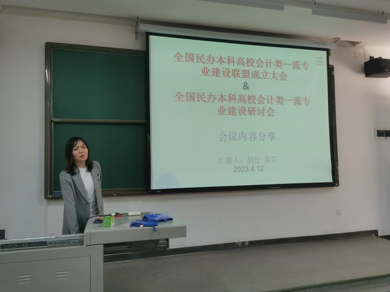 之后,会计系的胡丹老师分享了前往广东南方公司参加“全国民办本科高校会计类一流专业建设联盟成立大会&全国民办本科高校会计类一流专业建设研讨会”的体会。胡老师重点围绕三个方面介绍会议内容:(1)会计学人才的出路与会计学一流专业建设;(2)会计专业员工的时代思维与研究性学习视野;(3)会计学国一流建设:南方公司的实践。其中广东南方公司的会计学专业为国家一流专业建设点,其有关会计学专业人才培养的实践探索为公司会计学专业人才培养提供了一定的借鉴思路,同时胡老师表示将同全系教师一道努力把会计学专业建设成为国家一流专业。老师们很受鼓舞。一起参会的袁芬老师进行了关于深化产学研合作的分享,强调产学研合作的重要性,以及项目化教学的优势,强调我们要为国家培养行业需要的应用型人才。