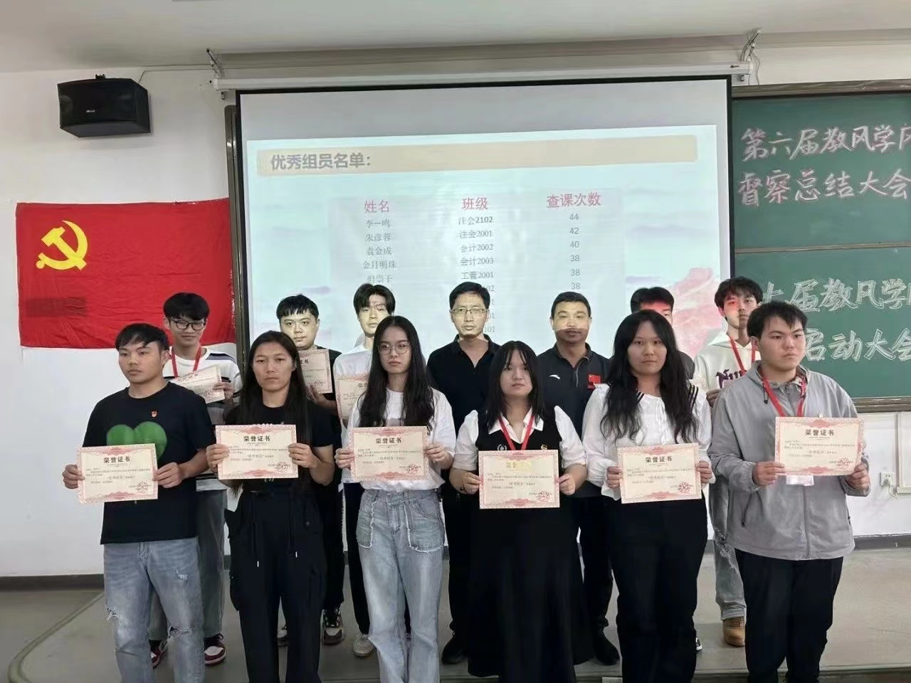 会议第五项:公布2022-2023学年教风学风督察组优秀组员名单并颁奖。由党总支书记孙建伟老师和团总支书记郭庆老师 为2022~2023学年教风学风督察组员李一鸣,朱彦蓉,袁金成等十一位同学颁奖。