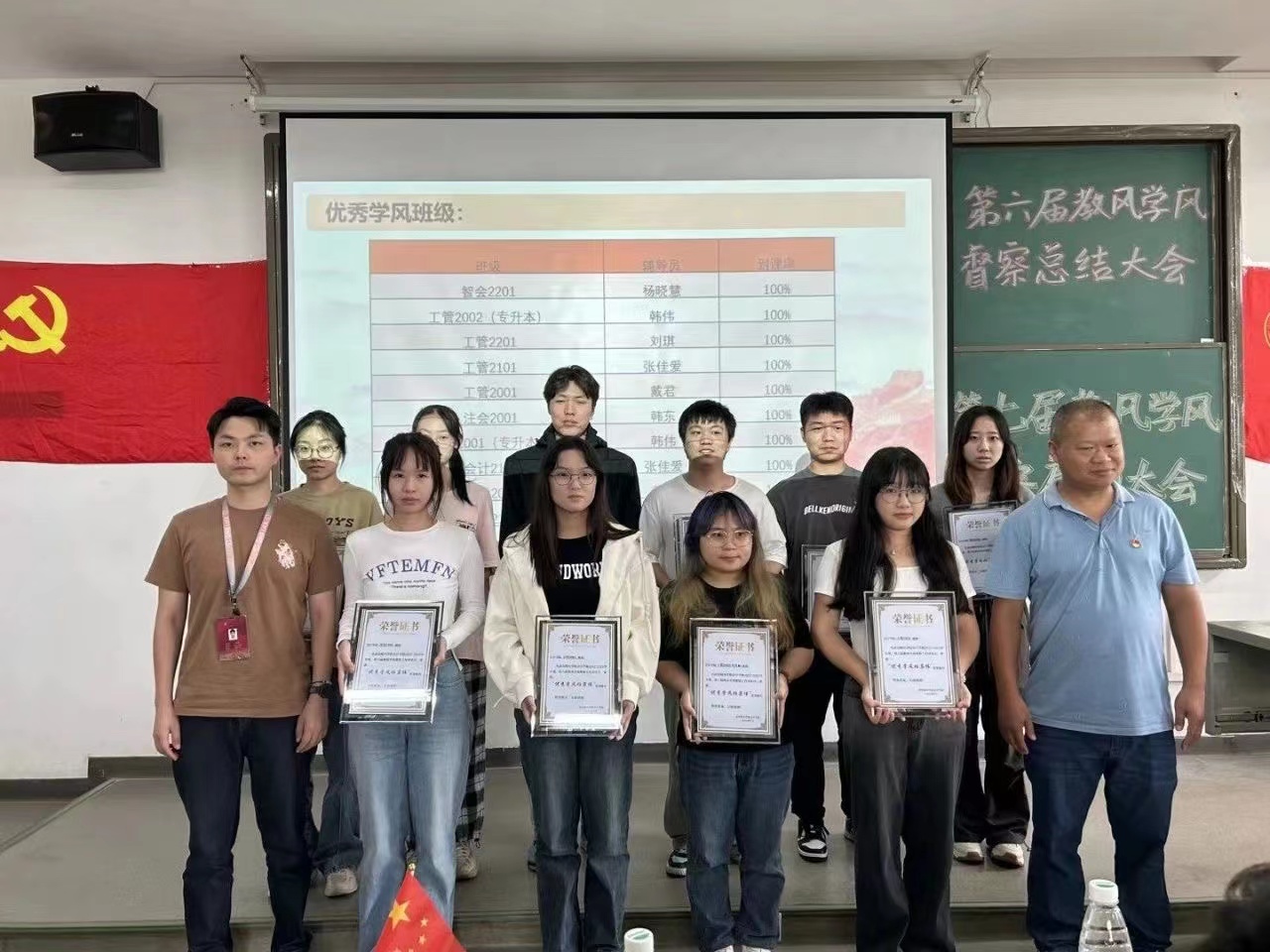 会议第四项:展示上学期各班级到课率并对优秀学风班级颁奖。由员工第一党支部书记韩东老师和第三党支部书记韩伟老师为智会2201,工管2002(专升本),工管2201等班级颁奖。