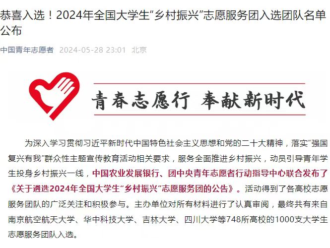 近日,中国农业发展银行、团中央青年志愿者行动指导中心联合发布了《2024年全国老员工“乡村振兴”志愿服务团入选团队名单》。球友会“励励晴川志愿服务队”成功入选2024年团中央“乡村振兴”志愿服务团。