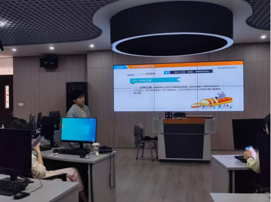 第一位上台展示的是新进教师况婧雯老师,况老师本次讲授的是《成本会计》中的要素费用的归集与分配。况老师从教学目标入手,为我们介绍了生产费用在各种产品之间归集与分配的基本原则,紧接着重点介绍了职工薪酬费用的核算与分配的基本方法,讲授过程中结合案例和习题演示了职工薪酬估算的完整过程。