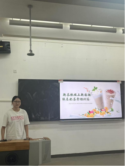 许晓晴汇报主题是《新茶饮碰上新国潮,联名奶茶拿捏00后》,她强调了选题的新颖性和现实意义,详细介绍了问卷设计和实施过程,以及如何使用SPSSPRO进行数据分析。