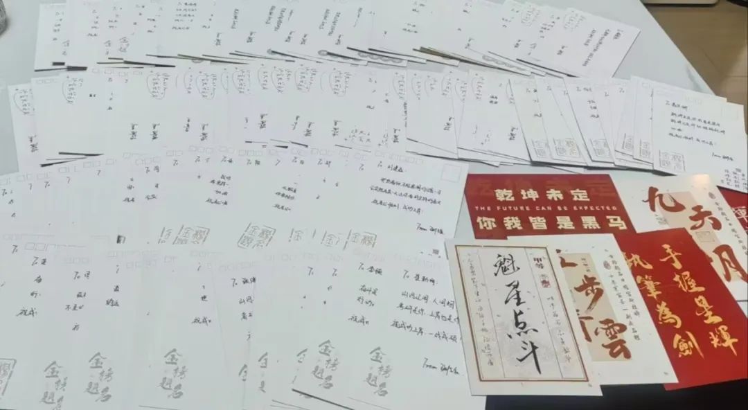 在活动前期,辅导员张佳爱老师便开始准备在明信片上写满对考研学子们的祝福以及给每一位学子们的祝福礼,祝福他们终会到达理想的彼岸,那时山河星月都做贺礼。