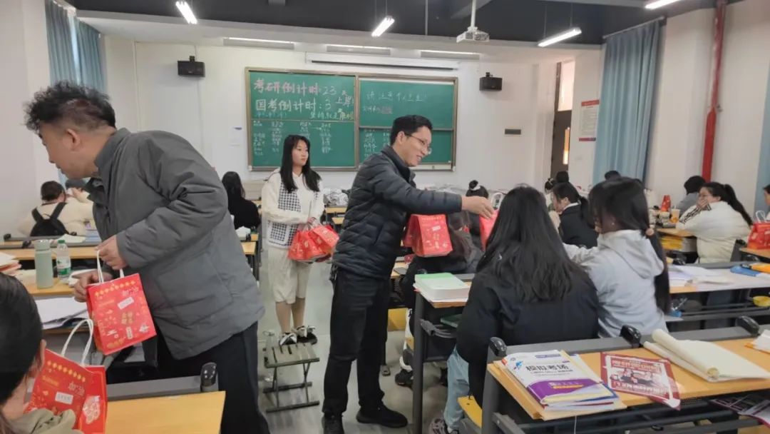 活动当天,书记带着满载关怀的礼包,逐一走访了备考同学的聚集地。每到一处,他都亲切地与同学们交谈,详细了解大家的学习进度、心理状态及面临的困难。书记的话语如同春风化雨,不仅缓解了同学们的备考压力,更激发了他们内心的斗志与信心。他强调:“考研考公之路虽长且艰,但正是这份坚持与努力,将铸就你们未来更加辉煌的篇章。公司永远是你们最坚强的后盾,愿你们以梦为马,不负韶华。”