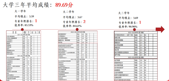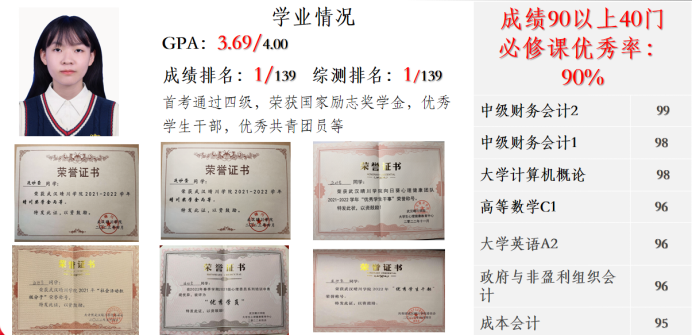 在学习方面,连妙莹始终保持对知识的渴望。她在2023-2024学年的专业成绩与综测排名均位列专业第一,专业绩点从大一的3.59提升至大三的3.69,必修课优秀率高达90.90%。过去三年中,修读了65门课程,其中40门成绩在90分以上,连续三年成绩位居专业前二。此外,获得了计算机二级、初级会计证书、普通话证书等多项专业技能证书,以及国家励志奖学金和晴川奖学金等荣誉,展示了扎实的专业基础和全面发展的能力。