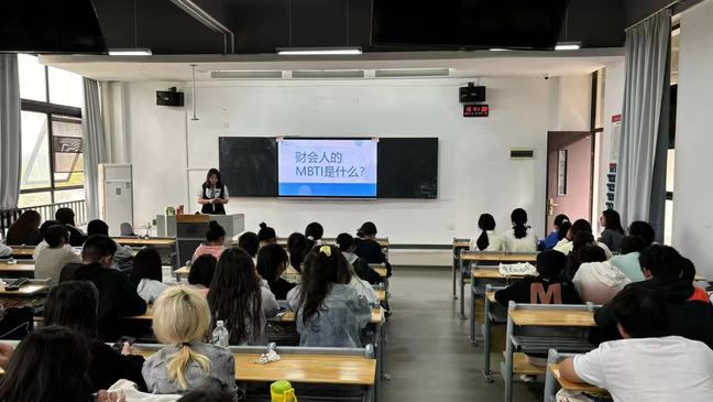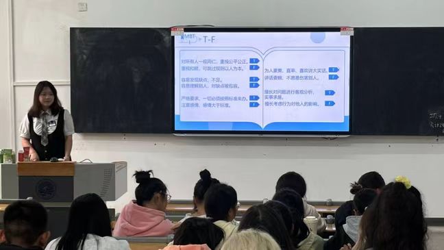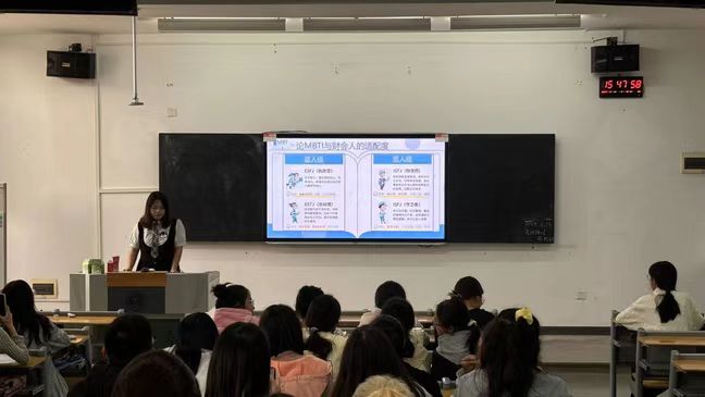 随后,王郭珺瑶学姐引领同学们步入MBTI性格探索之旅,随着字母的巧妙组合,各自的MBTI人格逐渐揭晓,每个人的独特性格被如绘画般细致地勾勒出来。学姐随后阐释了各个人格的性格特质,以及与之相匹配的和会计学专业相关的职业路径,深入探讨了MBTI与财会领域的契合度,同学们的未来职业画卷也因此在眼前愈发鲜明。