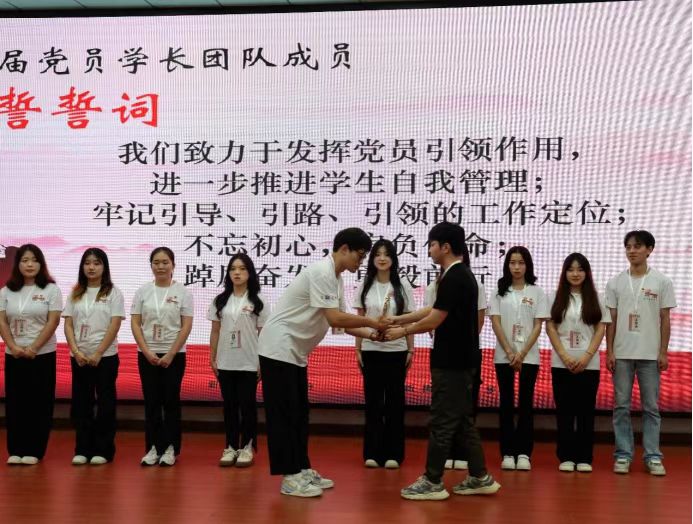 随后,大会举行了隆重的传承仪式。党员学长团队指导老师韩东老师宣读了第七届党员学长团队的任命名单。第六届党员学长团队为新成员颁发了牌匾,第七届党员学长团队在负责人江鸿胜的带领下庄严宣誓。铿锵誓言,既是党员学长的任务与使命,也是他们坚定的决心。在激昂的音乐声中,党员学长团队精神的火炬传递到了第七届党员学长手中,他们将继续在“三引”工作目标的指引下,发扬党的精神,陪伴学弟学妹们迈上新台阶,书写青春的华章。