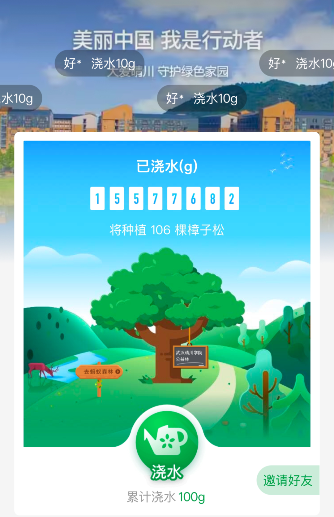 蚂蚁森林作为一款通过个人低碳行为实现社会公益行为的软件应用,截止2025年,已经在内蒙古,甘肃等十三个省份种植超过5.5亿棵数,在青海,云南等16个省份参与共建34个公益保护地。在蚂蚁森林中,用户通过将自己低碳行为的能量转化为灌溉树木的每一粒水滴,为建设绿色美丽中国贡献出自己的一份力量。在活动中,同学们通过给予蚂蚁森林中的小树苗水滴来换取“能量”,一方面能公益树木完成了浇水,宁一方面也让自己获得一份绿色植被,让同学们同时收获两份生命!