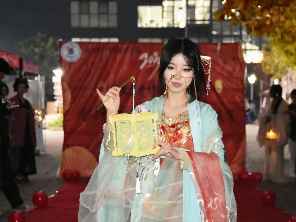夜幕降临,“花灯走秀”在期待中拉开帷幕。晴梦华衿汉服协会的成员们手持一莲沁馨、福蝶花韵、竹兰映雪等花灯,身着汉服,衣袂飘飘与花灯相得益彰。