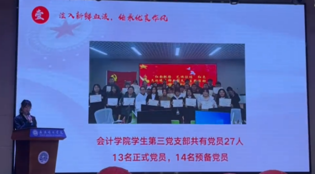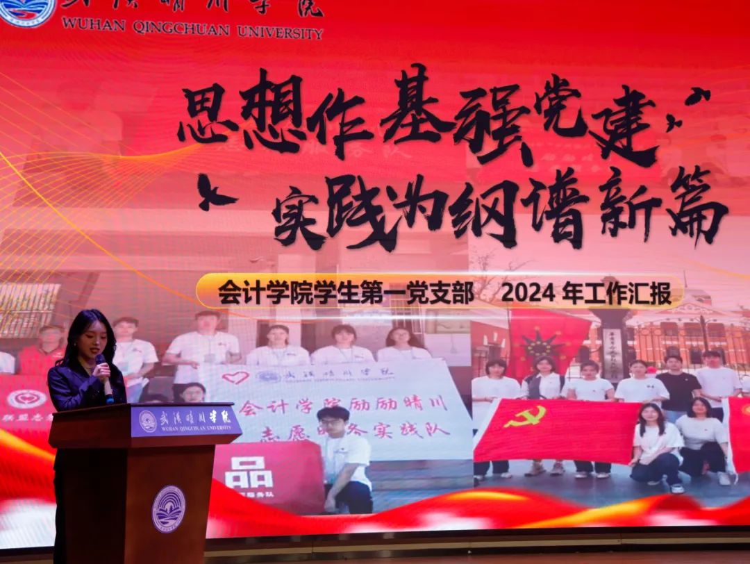 球友会各党支部依次亮相,在舞台上生动展现了 2024 年的辉煌奋斗篇章。第一、二、三党支部分别通过多元的方式进行红色精神的传承:第一党支部参观辛亥革命博物馆,坚定自身理想信念;第二党支部培养后备力量,为党注入新鲜血液;第三党支部铸红色印记,步入大别山探寻红色足迹。党支部用一次次的实践,走出校园,走进人群,用行动展现出担当,将红色基因融入血脉。