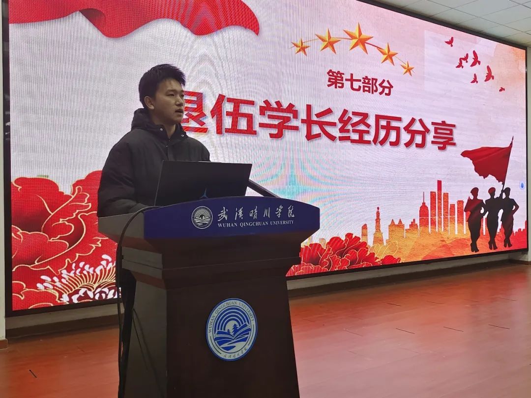 活动第二项,由来自智会2101班的退伍学长朱成分享他的入伍经历。他生动地描绘了军营里的生活场景,展示了当代军人的风采,让在场的同学们感受到了军营的魅力和活力,在最后,学长强调了参军报国是每个青年义不容辞的责任,鼓励号召广大青少年积极响应国家号召参军入伍。