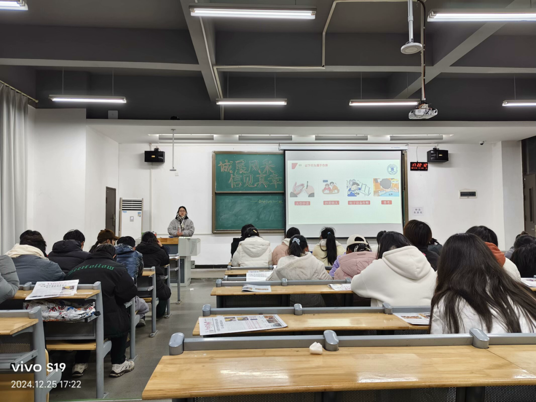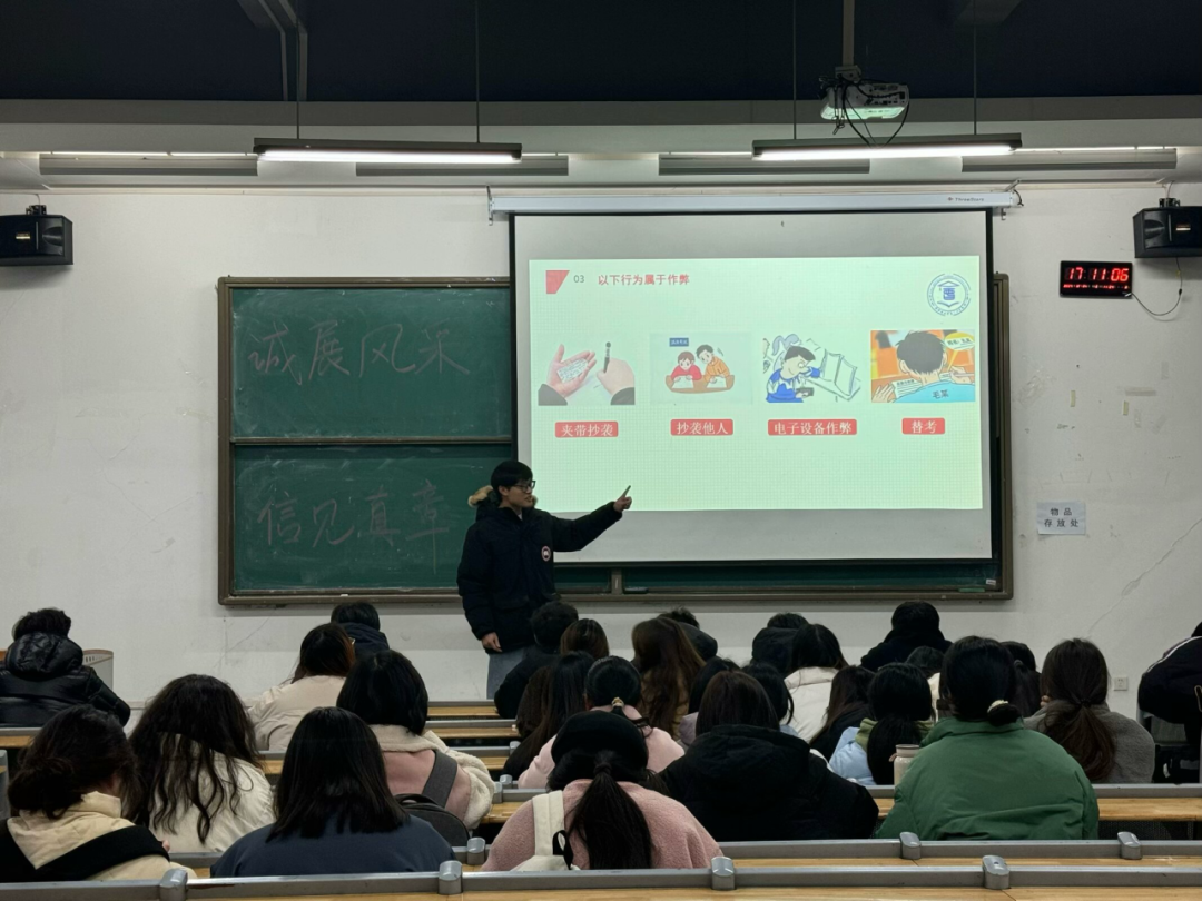 班助们重点介绍了作弊类型,如夹带抄袭、抄袭他人、利用电子设备作弊、替考等,并通过实际案例进行分析。深刻剖析了作弊行为对个人和集体的严重危害。于个人而言,作弊虽可能获取虚假成绩,但无法真正掌握知识技能,损害自身品德名誉,影响长远发展;从集体层面看,破坏公平竞争原则,打击努力学习同学的积极性,削弱学习氛围和学术风气,对教育环境和社会发展产生负面影响。