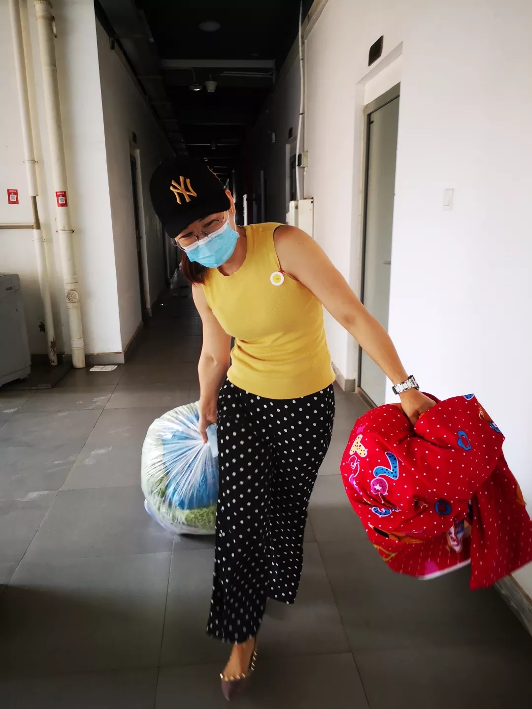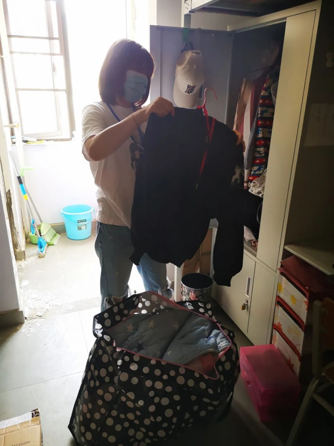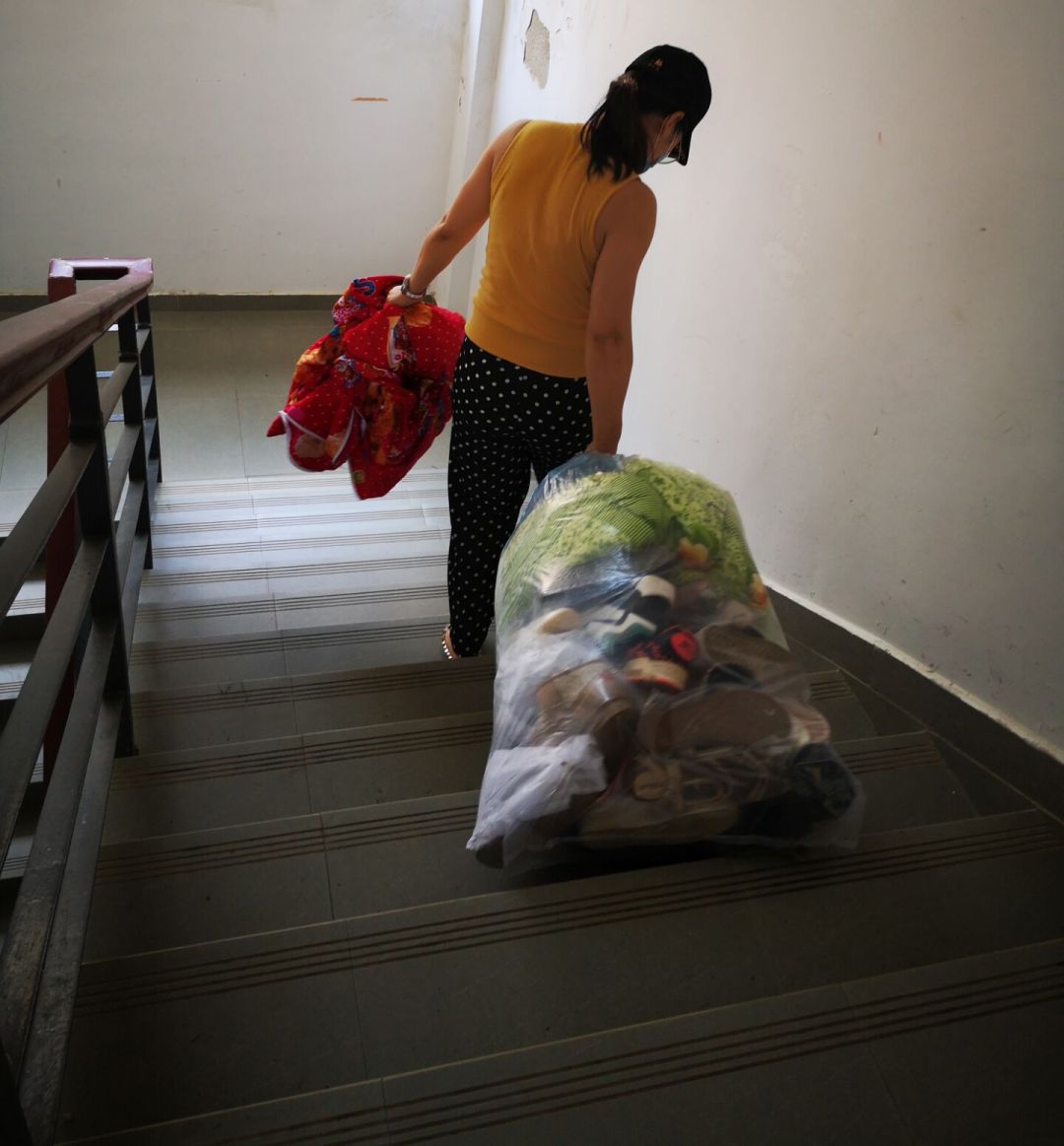 因为疫情,有一部分身在外省的毕业生不便返校整理行李,此外,还有一些毕业生由于返汉复工,急需拿取寝室的相关生活用品,得知这些毕业生的实际困难后,老师们主动承担起为员工打包行李的任务。整理搬运物品,事无巨细,本次为毕业生拿取的所需物品种类繁多,大至棉被、床垫、枕芯、行李箱,小至化妆品、衣服、鞋子、银行卡、学习书籍等。为了不遗漏毕业生所需的任何一件物品,每个角落老师们都仔细检查,为员工寻取所需物品。寝室整理完毕后,老师们用编织袋打包,徒手搬运至宿舍楼外,再用板车运送至校门口,交到员工手上或者交给快递公司进行寄送。
