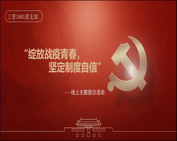 子里,工程管理1801全体同学在家中开展了以“绽放战疫青春 坚定制度自信”为主题的线上团日活动.参加此次活动的有辅导员韩东老师,前任辅导员、现基层工作人员汪清同志以及工管1801全体成员。