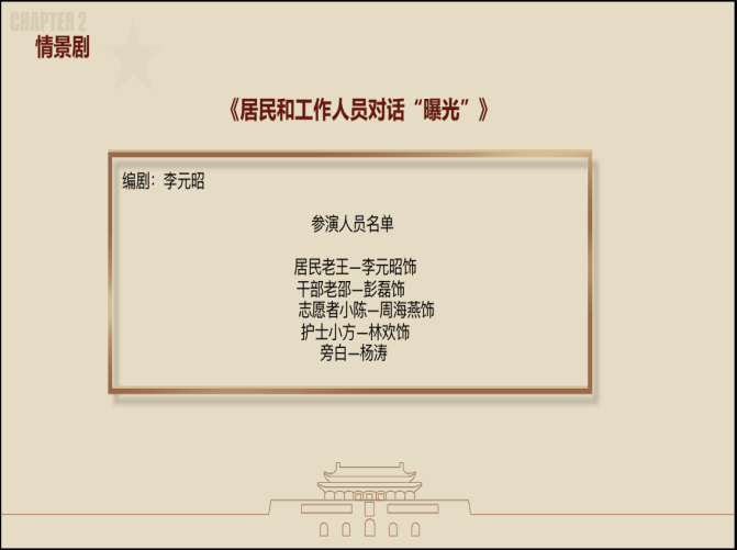 第二个环节是李元昭同学结合自身经历以及实际情况编写的,并有5个同学以连麦的方式表演的抗疫小短片,为同学们更加直观的介绍了各级防疫人员是如何让民众从不理解到大力支持疫情防控的小故事。同学们也真实体会到了工作人员的艰辛。疫情期间,社会各界全力支持国家的统筹安排,坚定打好疫情防控阻击战。幸得有这样的一群逆行者,他们用坚定的信念护得山河无恙,更幸得有像老王这样的居民,对于防控工作由不理解到理解到最后大力支持,战疫胜利号角声的吹响才得以一次又一次提前。