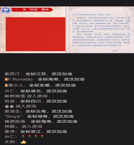同学们表述此次会议主题。从视频中可以看到武汉在遭遇疫情之后国家的及时应对,以及从全国奔赴湖北的医疗救援队...整个疫情期间,中国始终秉持着“一方有难,八方支援”的精神,让爱与希望温暖每颗中国心。