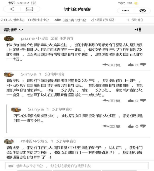 第二个环节是“集体大讨论”,在这个环节里大家畅所欲言的表达自己在此次疫情中的感悟,花样为国点赞。整个环节里听到最多的话——中国真棒,祖国加油!