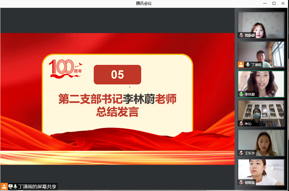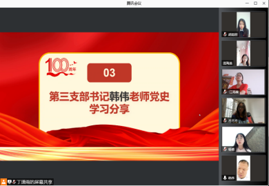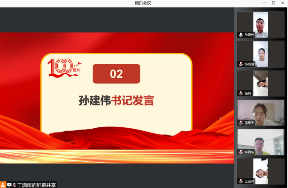 (通讯员:宋梦涵 摄影:黄静静)为热烈庆祝中国共产党成立100周年,学习总书记在“中国共产党成立100周年大会”上的重要讲话精神,2021年7月1日下午六点半,球友会员工第三党支部组织开展了以“七一”建党百年为主题的线上会议。会议由员工党员丁潇雨主持,党总支书记孙建伟同志、员工各党支部书记以及全体员工党员参会。