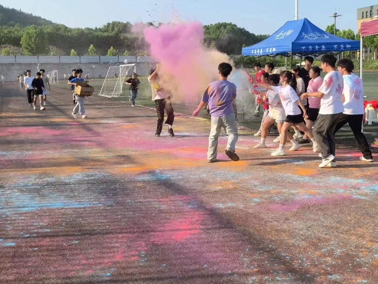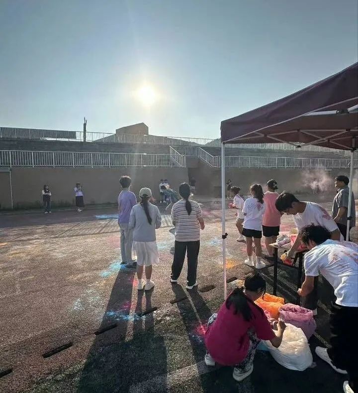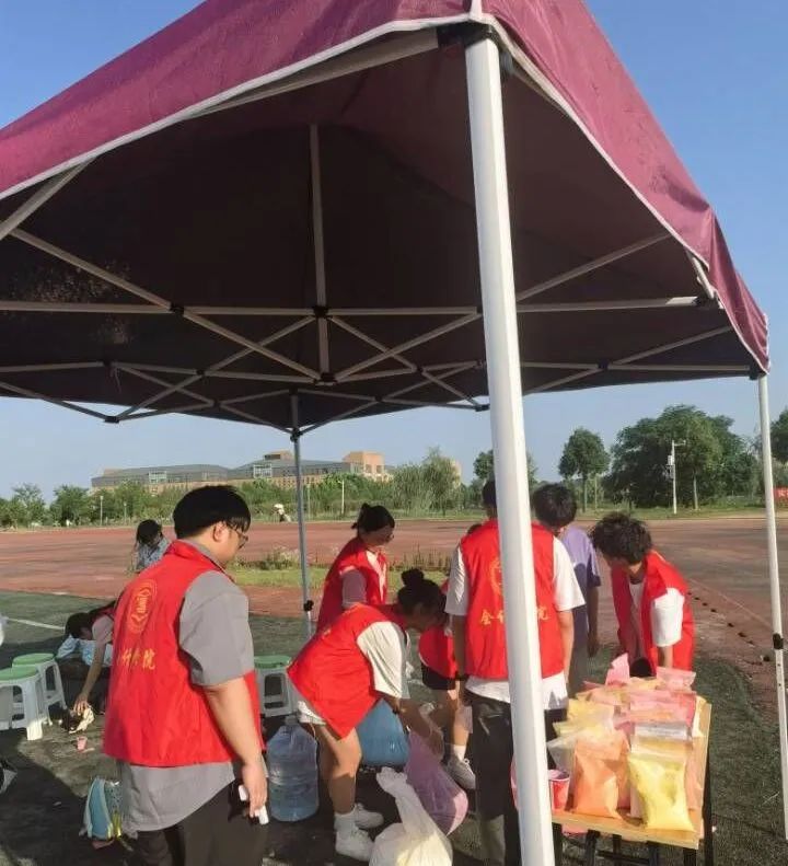 伴随着激昂的音乐,本次活动正式拉开帷幕。工作人员率先到达场地开始准备工作,若干名志愿者在操场帮忙一起搬帐篷,准备彩色粉末等等,并围绕操场设置了三个站点,以备即使补给物资。