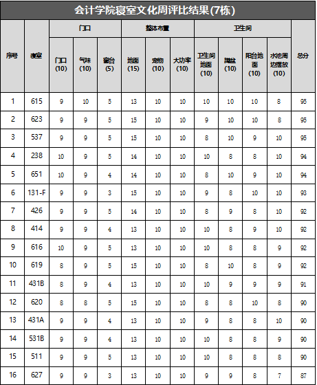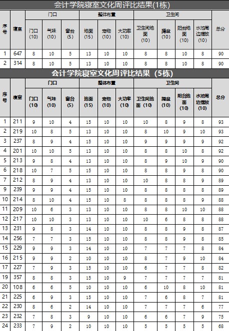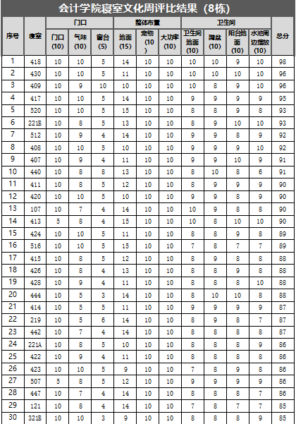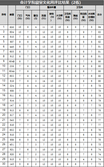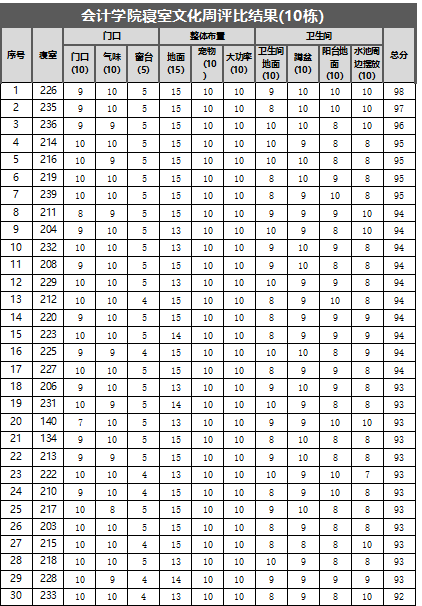 此次寝室文化周工作中,共检查6栋楼,1栋平均分90分,2栋平均分78.48分,5栋85.31分,7栋平均分92分,8栋平均分83.47分,10栋平均分93.11分,整体平均分87.06分,10栋取得最高分93.11分,寝室一共189个,其中女生寝室128个,男生寝室61个(以下是每栋楼前30名寝室分数明细)。
