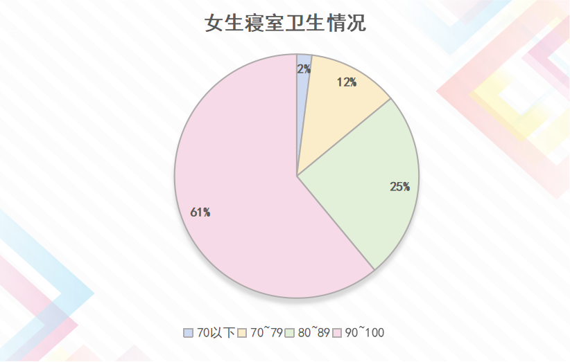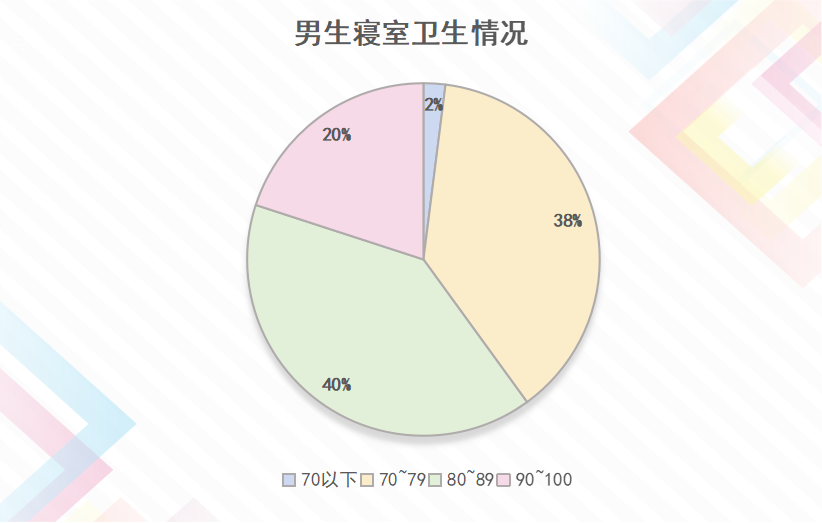 女生寝室中,评分优秀的占65%,评分良好的占 25%,不及格的寝室占5 %;男生寝室中,评分优秀的寝室占20%,评分良好的寝室占78%,不及格的寝室占2 %。