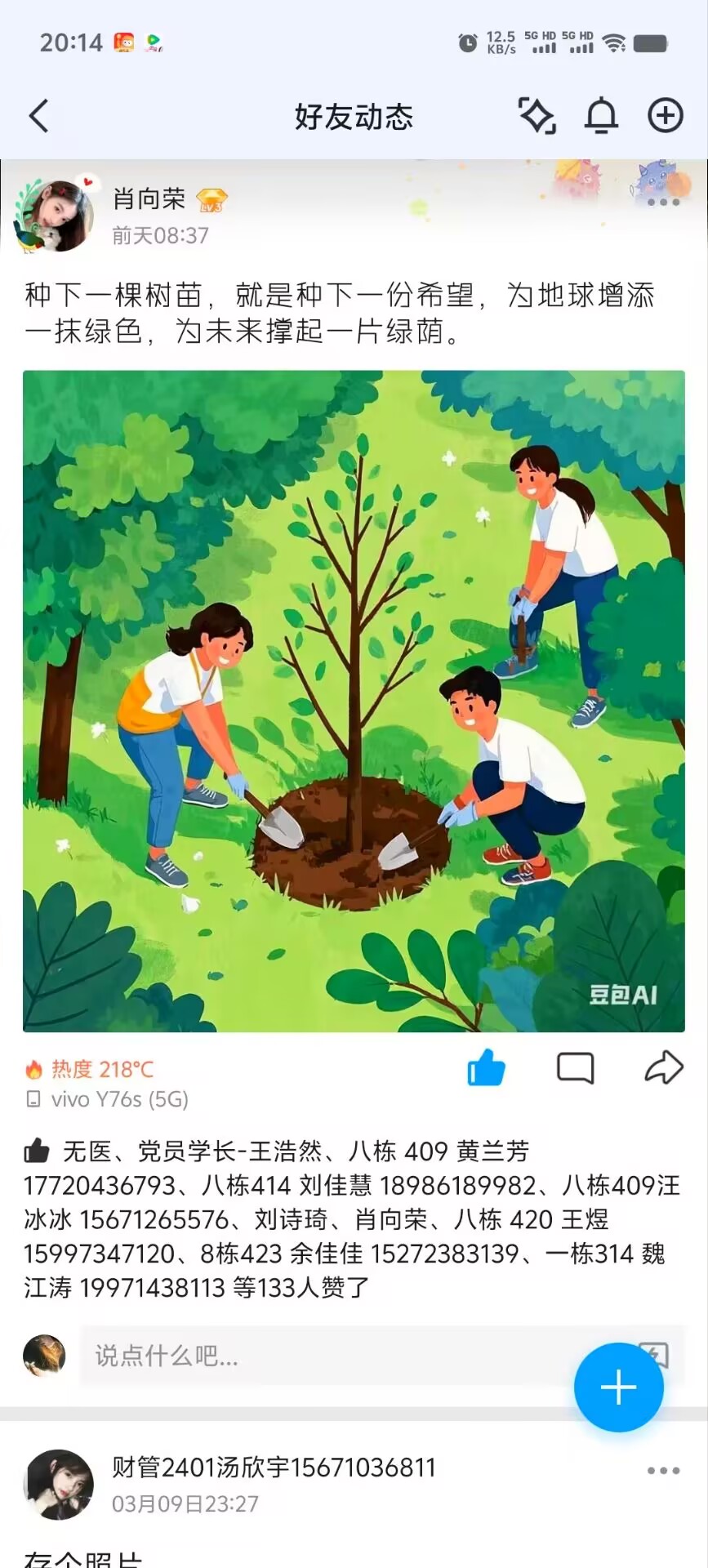 让地球更年轻,从我做起,从现在做起。同学们通过扫描二维码加入群聊、在朋友圈发布有关植树的相关话题来获得点赞等方式来参加此次活动,为绿化环境贡献属于自己的一份力量。绿色是生命的颜色,是青春的颜色。