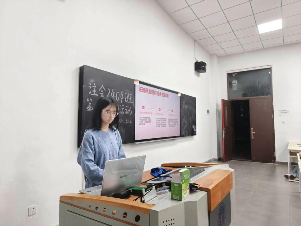 活动伊始,组宣委员吴宛璘同学为大家介绍了就业观的含义与内涵。吴宛璘同学指出,健康的就业观并非只看当下发展,其培养需要大家自主选择并且终身学习,这要求同学们需要怀有乐观积极的心态,将困难视作为成长与学习的机会。