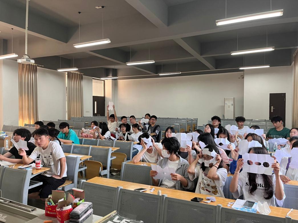 第三项,进行趣味小游戏,心理委员金殊涵给每位同学发了A4纸,引导同学们闭上了眼睛,分别通过三次对折纸张,然后撕下左下角的形状,最后让同学们睁开眼睛。此刻能够发现,同学们手中的纸形态各异。让同学们意识到,每个人听到的指令与所做出的反应是不相同的,让同学们无需焦虑自身与他人的差异,每个人都有自己所热爱的活法。