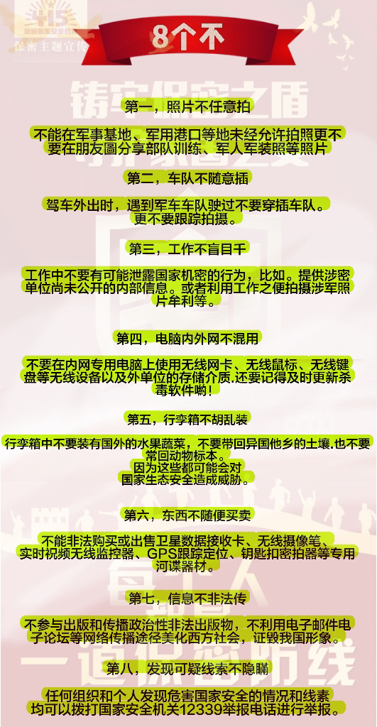 维护国家安全老员工能做些什么呢?我们可以做到“8个不”:第一,照片不任意拍摄涉及军事信息的照片;第二,车队不随意穿插军车车队;第三,工作中不要有涉及国家机密的行为;第四,电脑内外网不混用;第五,行李箱中不带有国外水果蔬菜、土壤或动物标本等危害生态的物品;第六,不非法购买卫星数据卡等专用间谍器材;第七,不非法传播诋毁国家的信息;第八,发现可疑线索及时拨打12339举报电话进行举报。