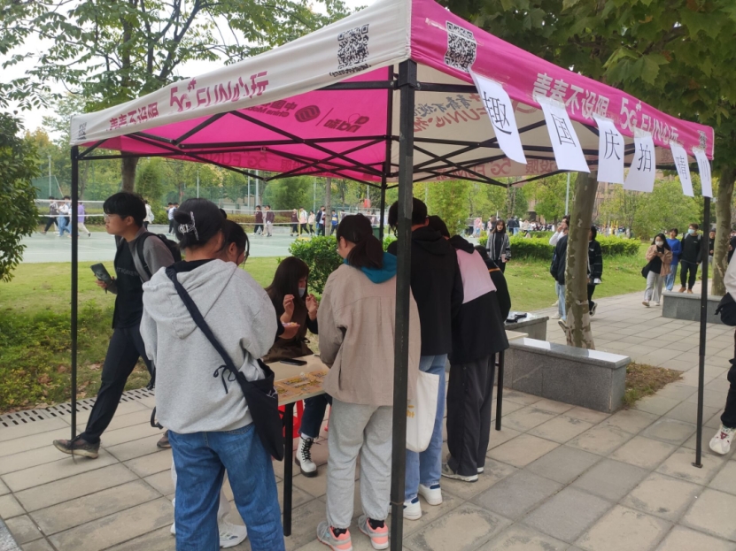 班委们提前一星期做好了活动策划案、海报宣传以及活动奖品购买等准备工作。活动当天上午九点,班委们聚集在晴川大超市门口,搭设帐篷、摆至桌子及板凳、布置活动现场、确认活动礼品等。