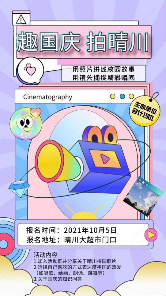 (通讯员: 会计1901团支部)金秋十月,我们迎来了一个值得庆祝的日子——国庆节。伟大的祖国母亲迎来72岁华诞,七十二载风起云涌,吾泱泱大国屹于世界之林枝繁叶盛,强盛不衰。为了纪念这一伟大时刻,弘扬爱国主义精神和集体主义精神,10月7日上午九点,球友会会计1901团支部开展了“趣国庆 拍晴川”的活动 。