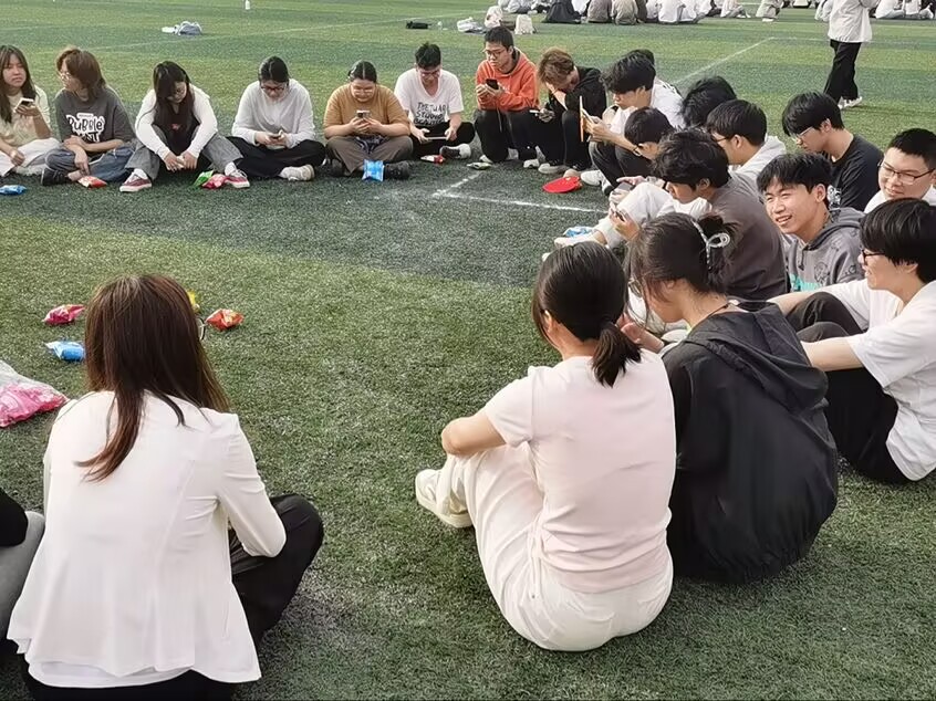 上午七时,阳光映照下的操场洋溢着青春气息。全班同学整齐围坐成同心圆,在团支书滕雅茹的带领下齐唱国歌。铿锵的旋律中,同学们肃然而立,目光坚定,以歌声致敬那段烽火岁月。随后,滕雅茹简要介绍了抗战胜利的历史意义,并为大家分发各式各样的小零食,现场气氛热烈而温馨。