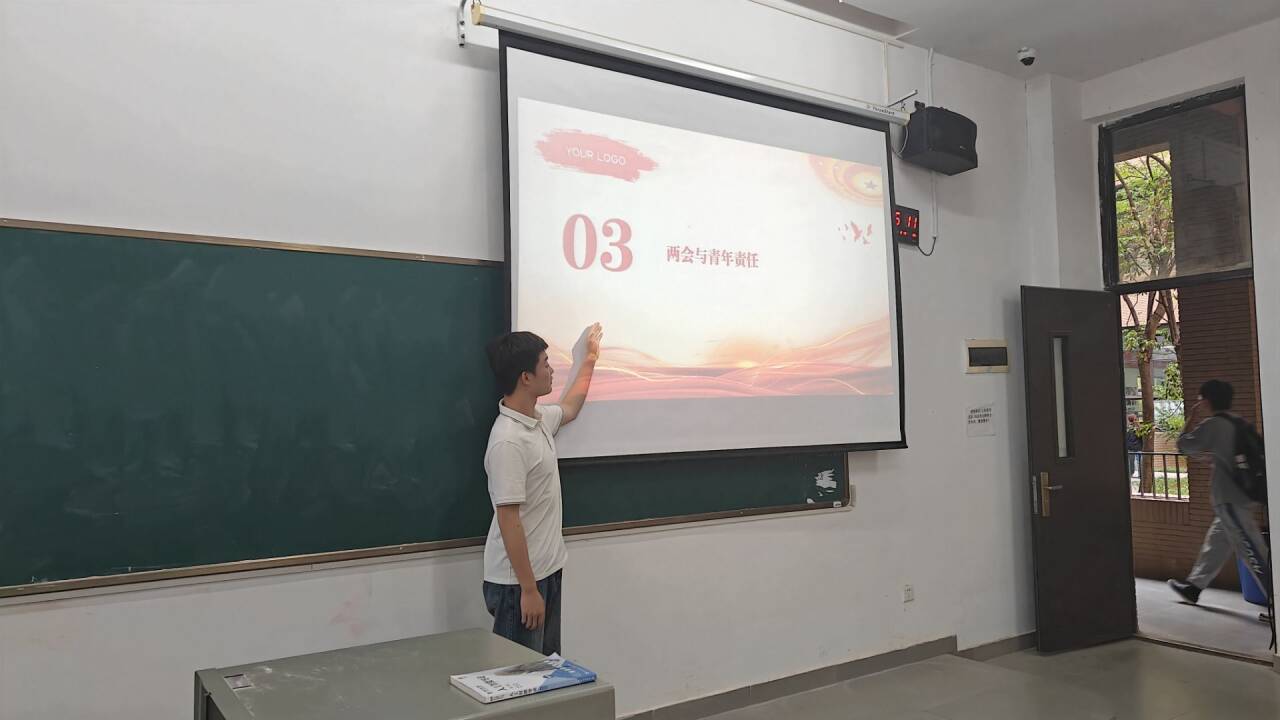 活动伊始,团支书借助精心制作的 PPT,带领全体团员一同回顾了两会的重要内容。从政府工作报告中的民生举措,到经济发展的新方向,团支书详细解读了两会中的各项热点议题,使同学们对国家发展的战略布局有了更为清晰的认知。 同学们专注聆听,不时记录要点,活动气氛热烈而庄重。